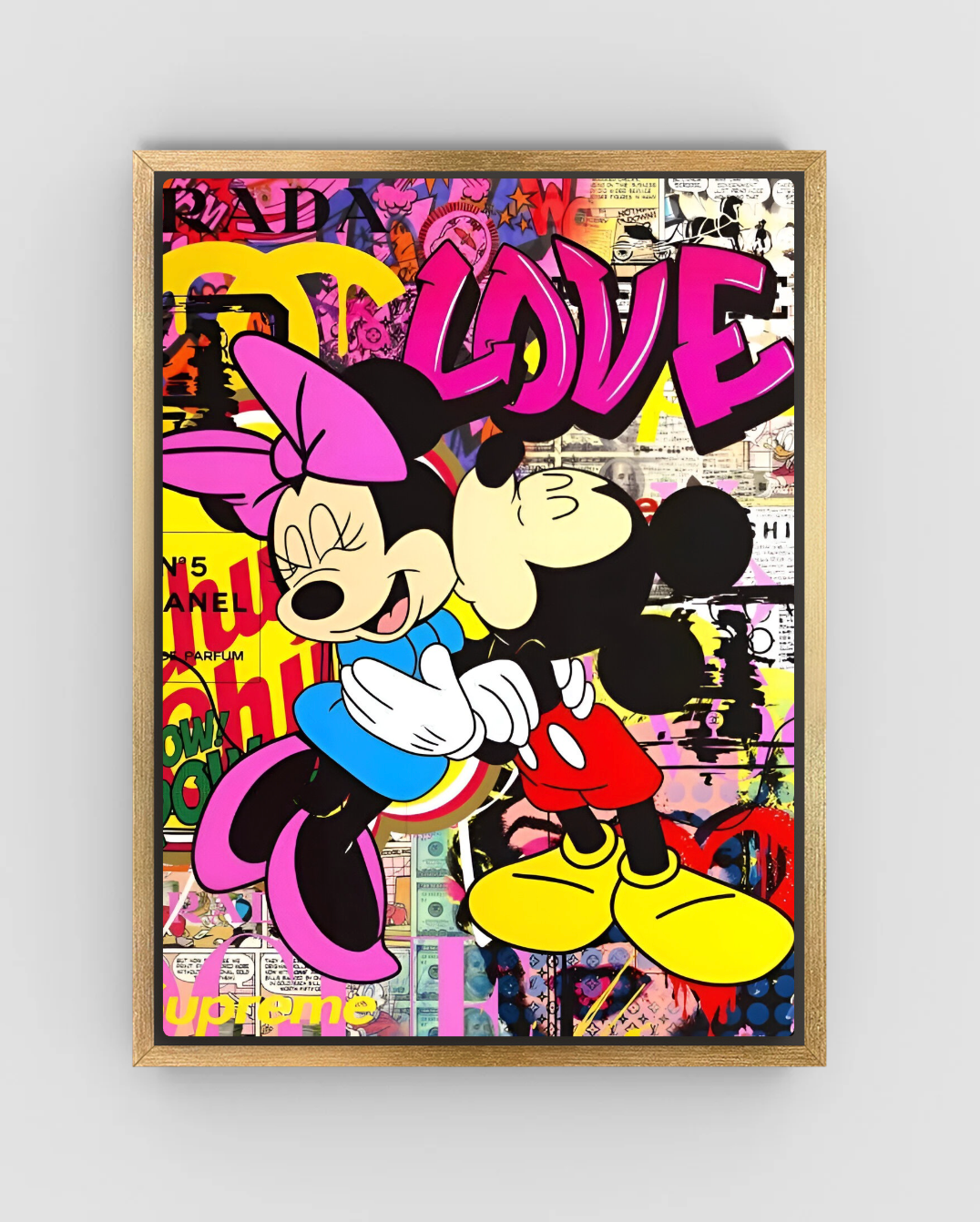 Celebrate love and pop culture with Luxury Collection No. 02 from Van Gogh Limited. This modern art print showcases Mickey and Minnie Mouse in a bold, colorful embrace against a vibrant collage backdrop. The design mixes graffiti, fashion logos, and street art textures, creating a playful yet striking piece that blends nostalgia with luxury style.