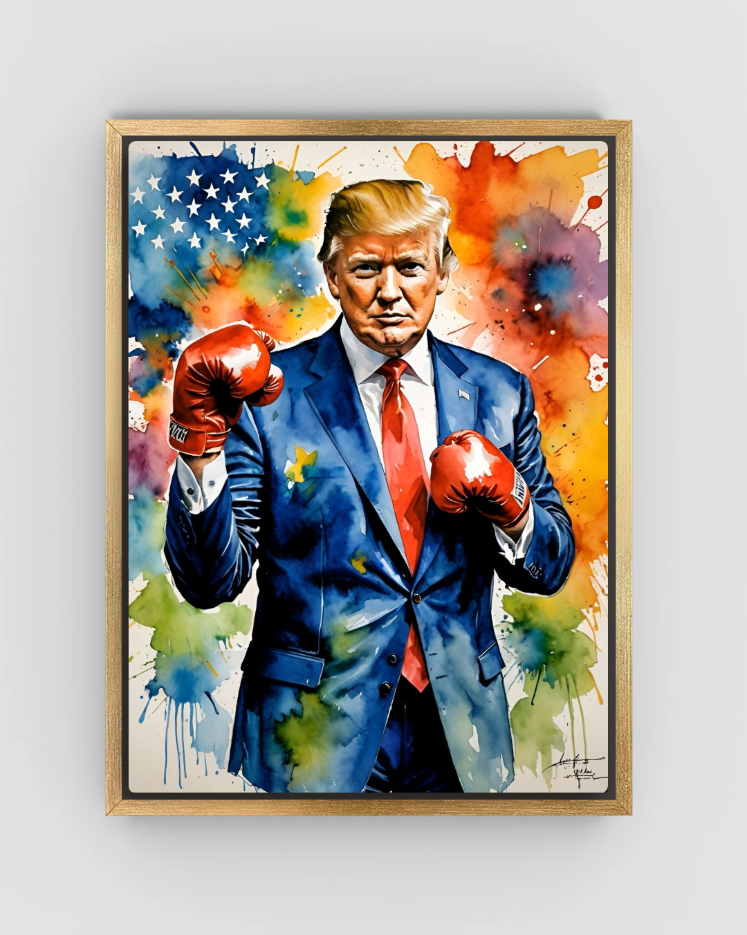 Bring bold energy to your space with Pop Avenue No. 34, a standout piece from the Pop Avenue collection. This striking art print features former U.S. President Donald J. Trump in a full suit and red boxing gloves, standing strong against a background of explosive color. Red, blue, orange, and green splashes create a vivid backdrop full of movement and power.