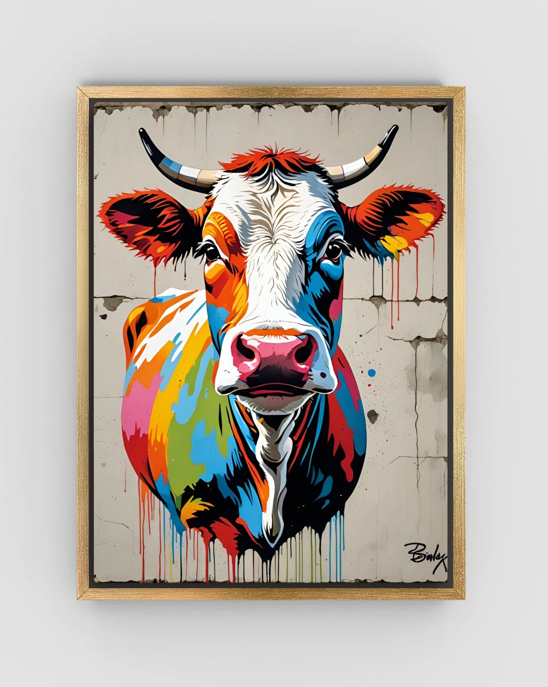 Add bold charm and humor to your space with this stunning cow art print. Pop Avenue No. 36 turns an ordinary animal into a modern icon. With vibrant colors splashed across a concrete-style background, this piece is a perfect mix of street art and pop flair.